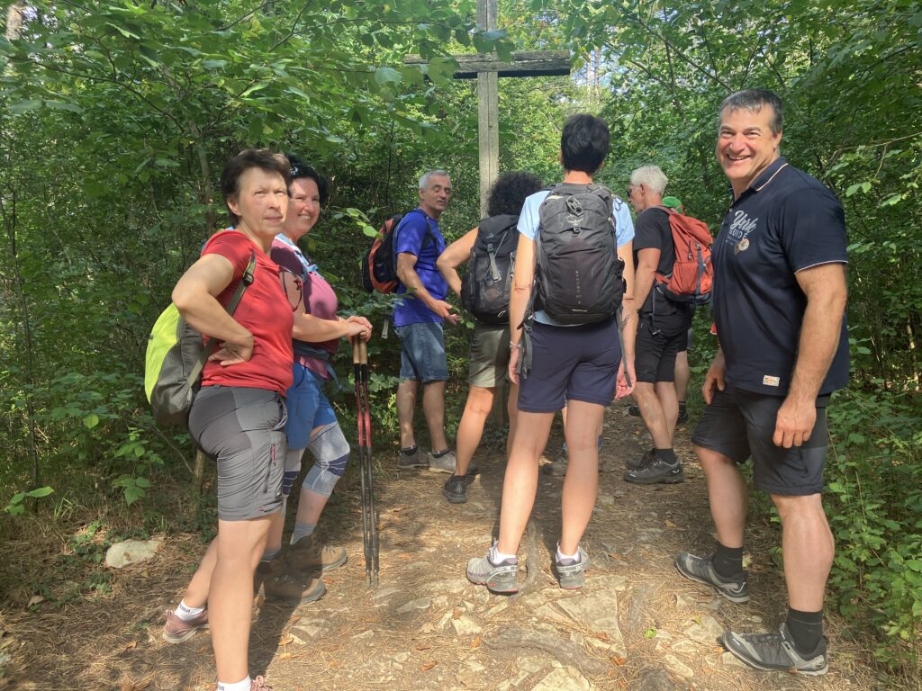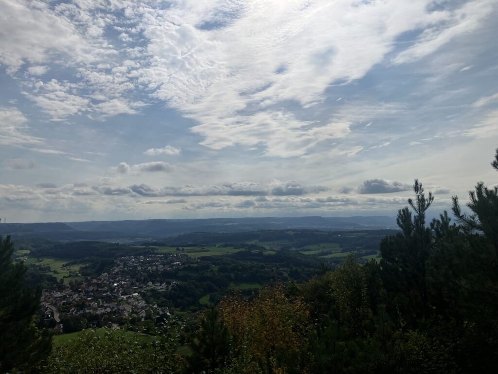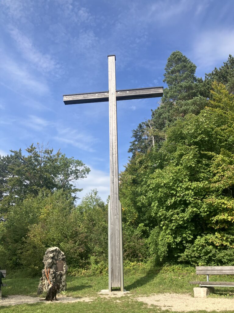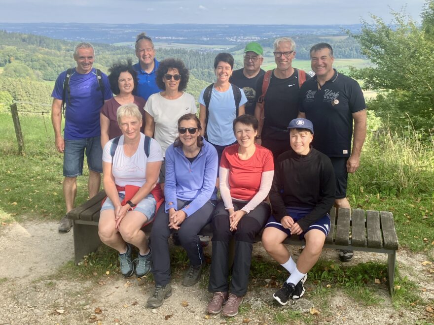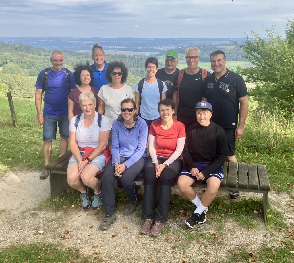 Winzingen nach Wißgoldingen. Der (sehr) steile Anstieg auf die Höhe wurde mit einem tollen Rundum-Weitblick belohnt. Nach der Mittagspause auf der Sonnenterrasse ging es noch höher hinauf auf den Stuifen. Dort bekamen die Erdlinge für die geleisteten Höhenmeter am Gipfelkreuz einen Gipfelschnaps.