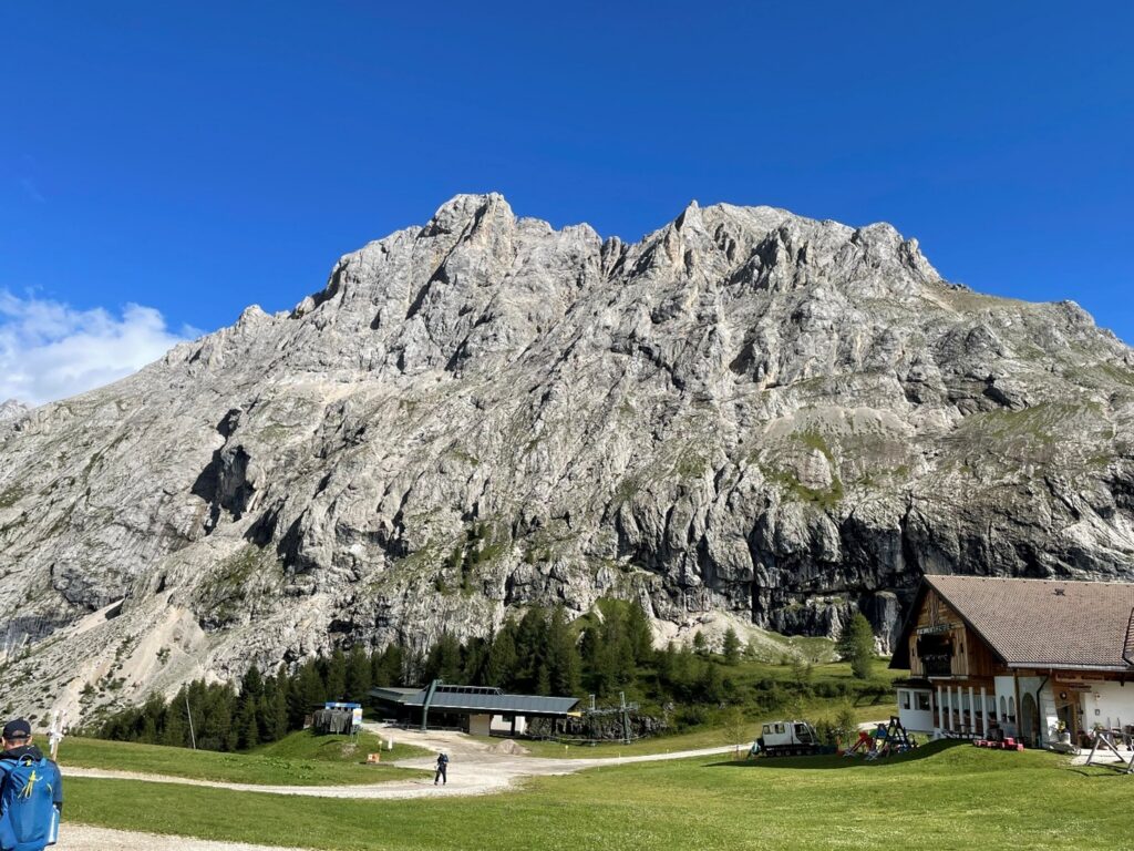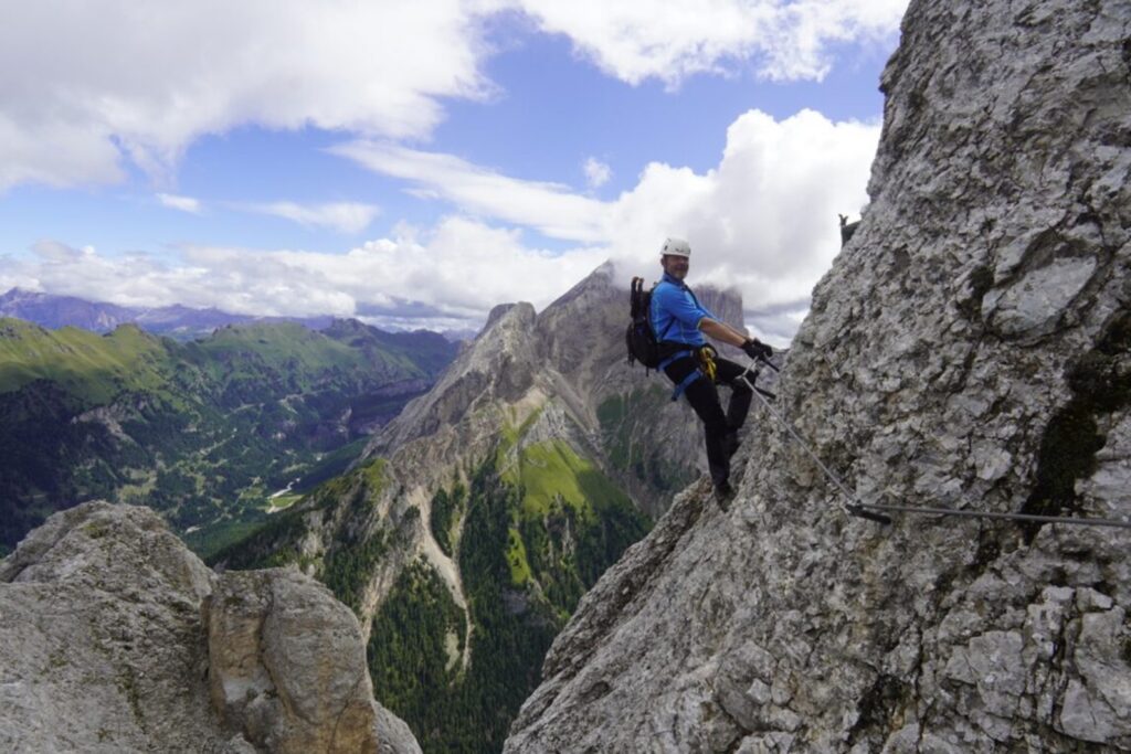 Mit der ersten Seilbahn sind wir hoch zur Franz Kostner-Hütte auf 2.550 Hm gefahren. Von dort aus waren wir in einer halben Stunde am Einstieg zum Vallon-Klettersteig. Ein angenehmer Steig mit mäßiger Schwierigkeit – genau das richtige für den ersten Tag.