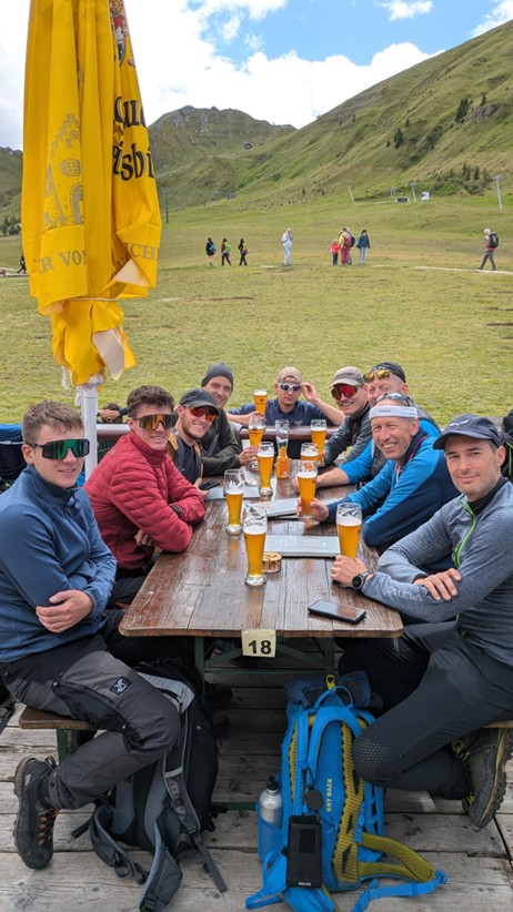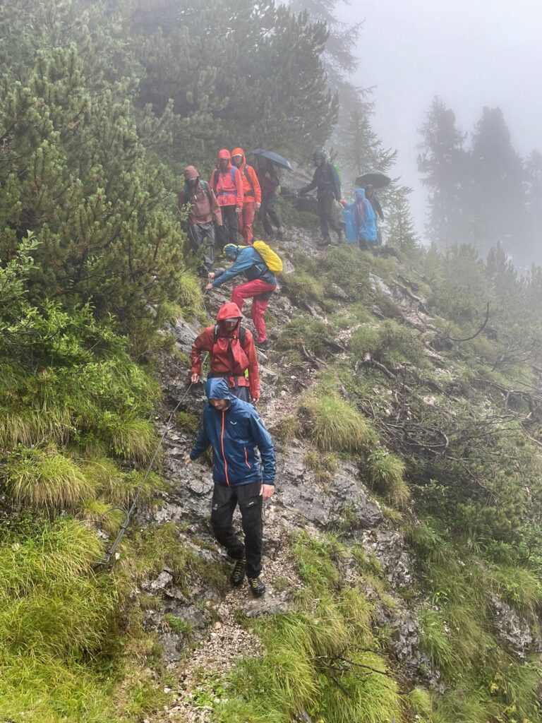 Der Abstieg hatte auch ein paar gesicherte Stellen, die alle locker, aber konzentriert bewältigten. Der Abschluss der Tour auf der Alm bei der Seilbahn war ein weiteres Highlight des Tages – war doch auf der sangesgewaltiger Bergsteigerchor.