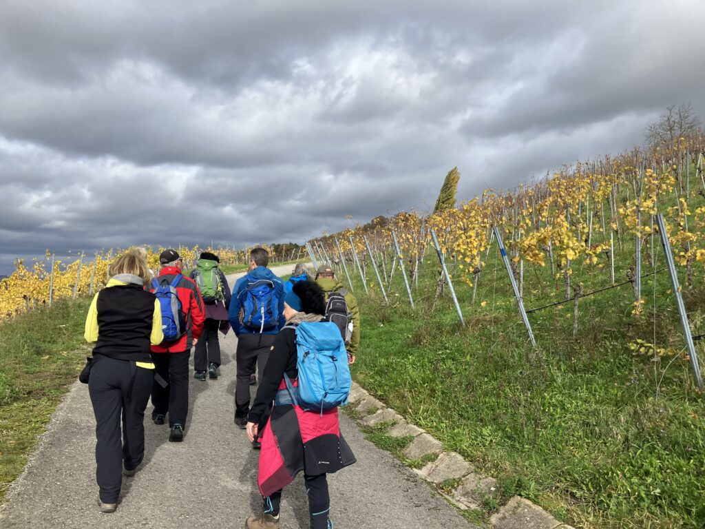 26 Wanderer trafen sich am Bahnhof in Winnenden. Zunächst ging der Weg durch die schöne Altstadt über den Ort Höfen in die umliegenden Weinberge. Über steile Wege wanderten wir zum höchsten Punkt nach Bürg. Von dort hatten wir eine grandiose Aussicht auf die Felder und Wälder im herbstlichen Kleid.